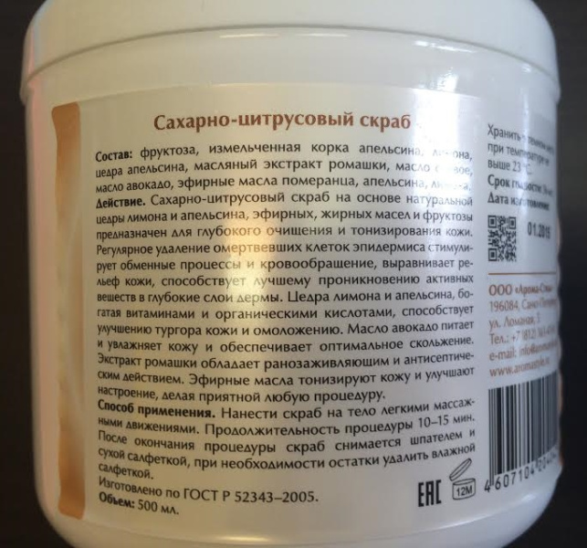 Cкраб для тела предназначен для глубокого очищения и тонизирования кожи. Регулярное удаление омертвевших клеток эпидермиса стимулирует обменные процессы и кровообращение, выравнивает рельеф кожи, способствует лучшему проникновению активных веществ в глубокие слои дермы. Цедра лимона и апельсина богатая витаминами и органическими кислотами, способствует улучшению тургора кожи и омоложению. Масло авокадо питает, увлажняет кожу, обеспечивая оптимальное скольжение. Экстракт ромашки обладает ранозаживляющим и антисептическим действием. Эфирные масла тонизирую кожу и обладают ароматерапевтич. действием.